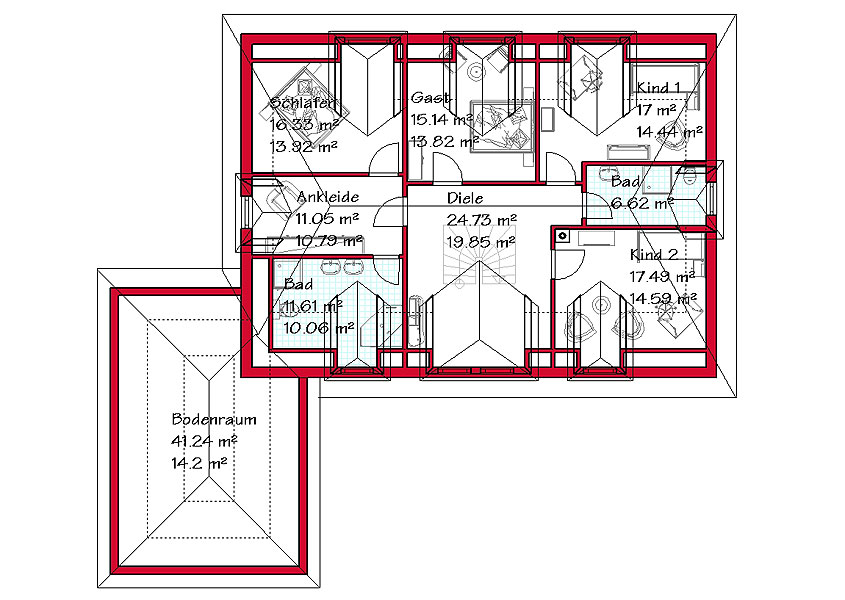 Das eigene Haus bauen ist mit viel Verantwortung verbunden – wenn Sie sich für einen Bungalow von RHEIN-MAIN HAUSBAU entscheiden, dann dürfen Sie sich zurücklehnen, denn wir versprechen Ihnen ein schlüsselfertiges Massivhaus, das Ihnen Entspannung während und nach der Bauphase bietet. Mit einer Gesamtwohnfläche von 231,4 m², die individuell auf 200 – 270 m² verändert werden kann, erhalten Sie in diesem Einfamilienhaus ausreichend Platz. Der Raum verteilt sich dabei auf 127,3 m² im Erdgeschoss sowie 104,1 m² im Dachgeschoss. Neben dem großzügigen Raum im Dachgeschoss erwarten Sie bei diesem Bungalow ein Hauswirtschaftsraum, ein Büro, Küche, Flur, großzügiger Wohn- und Essbereich, Diele und Bad. Auch eine 41,24 m² große Garage verspricht zusätzlichen Platz für Ihre Autos und die Aufbewahrung anderer Geräte. Mit einer tollen überdachten Terrasse können Sie Sommer und Frühling im Schatten genießen.