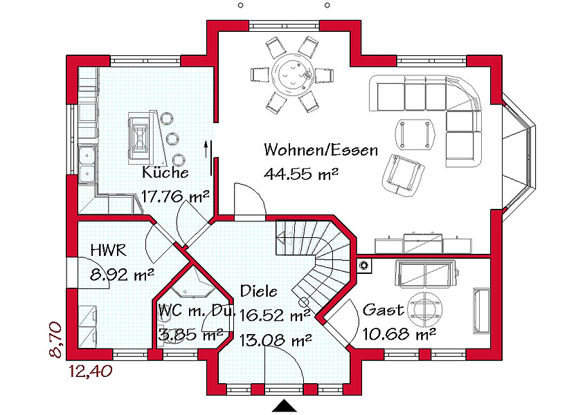 Wenn Ihnen dieses Mehrgiebelhaus gefällt und Sie sich schon jetzt mit Ihrer Familie in den Räumlichkeiten in diesem Massivhaus sehen, dann wenden Sie sich RHEIN-MAIN HAUSBAU. Hier wird zunächst das Einfamilienhaus nach Ihren persönlichen Wünschen und Bedürfnissen geplant, um es anschließend von erfahrenen und zuverlässigen Partnern errichten zu lassen. So wird der Hausbau mit RHEIN-MAIN HAUSBAU für Sie zum stressfreien Erlebnis, an dessen Ende Sie das Massivhaus schlüsselfertig übernehmen können. Für den pünktlichen Einzug sorgt die garantierte Bauzeit von RHEIN-MAIN HAUSBAU von 16 Wochen. Wird diese nicht eingehalten, werden Ihnen pro überfälliger Woche 2500 Euro vom Kaufpreis erlassen.