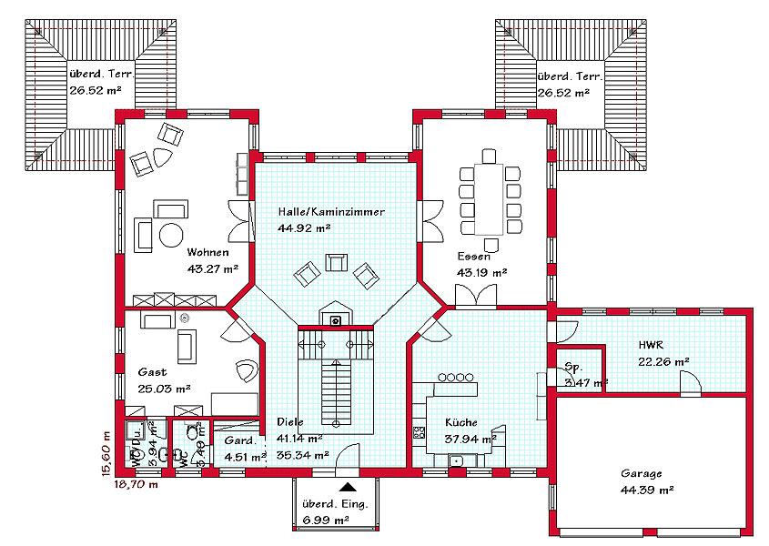 Wohnen mit Stil, das ist bei diesem Landhaus mit großem umlaufenden Balkon nicht nur ein Versprechen, sondern absolute Gewissheit. Bei diesem großzügig geschnittenen Einfamilienhaus stehen Ihnen und allen weiteren Bewohnern insgesamt 421,9 m² zur Verfügung, auf denen gelebt, geliebt und gearbeitet werden kann. Das luxuriöse Erscheinungsbild setzt sich in der weitläufigen Gestaltung des Innenlebens fort, wo im Erdgeschoss 269,4 m² und im Obergeschoss 152,5 m² geboten werden. Die Wohnfläche wird in diesem Landhaus von Wohnzimmer, Esszimmer, Halle mit Kaminzimmer, Gästezimmer, Küche, Diele, Garderobe, WC, WC mit Dusche, Hauswirtschaftsraum, 2 Kinderzimmern mit Kinderbad, Badezimmer, Schlafzimmer und Ankleidezimmer eingenommen, was Ihnen viel Platz für die Verwirklichung all Ihrer Wohnideen bietet. Besondere Highlights dieses exklusiven Landhauses sind der umlaufende Balkon und die zwei überdachten Terrassen.